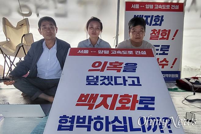 단식 농성장에서 만난 여현정 양평군의원은 "저희와 국민의힘도 백지화를 철회시키려는 입장은 같을 것"이라며 "그런데 (전 군수 등 국민의힘 측은) 백지화를 민주당 탓으로 돌리며 '민주당을 추방시키자'는 말까지 한다"고 주장했다.
