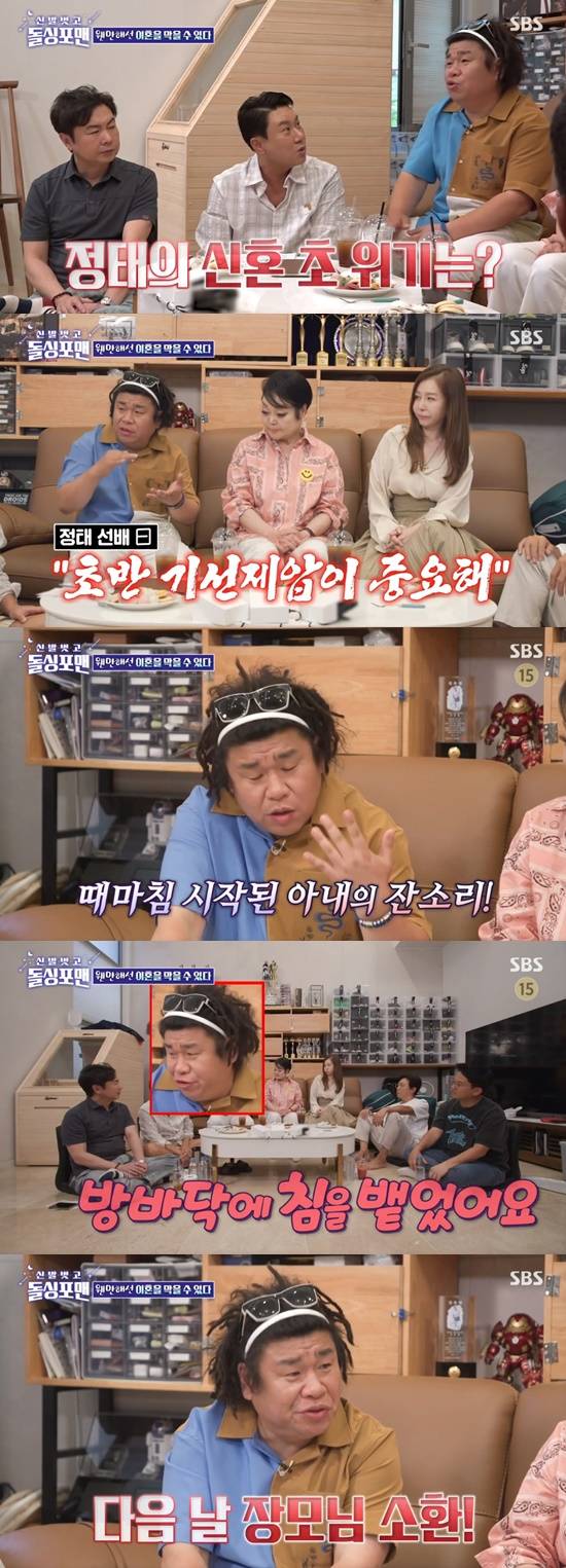 오정태는 "신혼 초에 아내가 10배 변하더라. 선배님들이 초반 기선 제압이 중요하다고 조언했다. 때마침 아내가 잔소리를 하길래 방바닥에 침을 뱉었다"며 황당 일화를 공개했다.