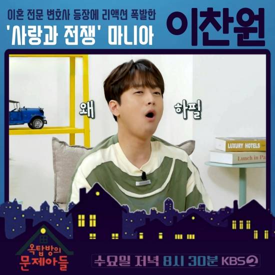 (엑스포츠뉴스 이정범 기자) '옥탑방의 문제아들' 이찬원이 이혼 전문 변호사들의 등장에 화색을 띄며 몰입했다.