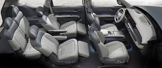 실내는 대형 전용 전기차의 장점인 공간을 최대한 활용했다. 운전석은 편안한 탑승과 운행을 위한 두 마리 토끼를 잡았다. 센터 콘솔의 전면이 조수석과 뚫려있어 공간감이 더욱 넓게 느껴진다. 4스포크 스티어링 휠은 다기능 버튼과 드라이브/터레인 모드 버튼까지 준비했다. 중앙의 KIA 엠블럼 조명은 덤이다. 컬럼 타입 전자식 변속레버는 후진 시 햅틱 기능까지 제공한다. 운전석은 전동 조절 다리 지지대를 포함한 10방향 전동 조절에 4방향 에어셀타입 허리 지지대와 스티어링 휠 위치까지 기억하는 운전 자세 메모리 시스템과 에르고 모션 시트를 추가 적용했다. 볼스터 전동조절과 컴포트 스트레칭 기능까지 확장했다. 고급 차를 제외하면 최고의 시트 구성이다. 동반석은 2방향 에어셀 타입 허리 지지대와 볼스터 전동 조절이 삭제된 것을 제외하고는 운전석과 동일하다. 기아의 앞좌석도 최고 수준에 다가가고 있다는 증거다.