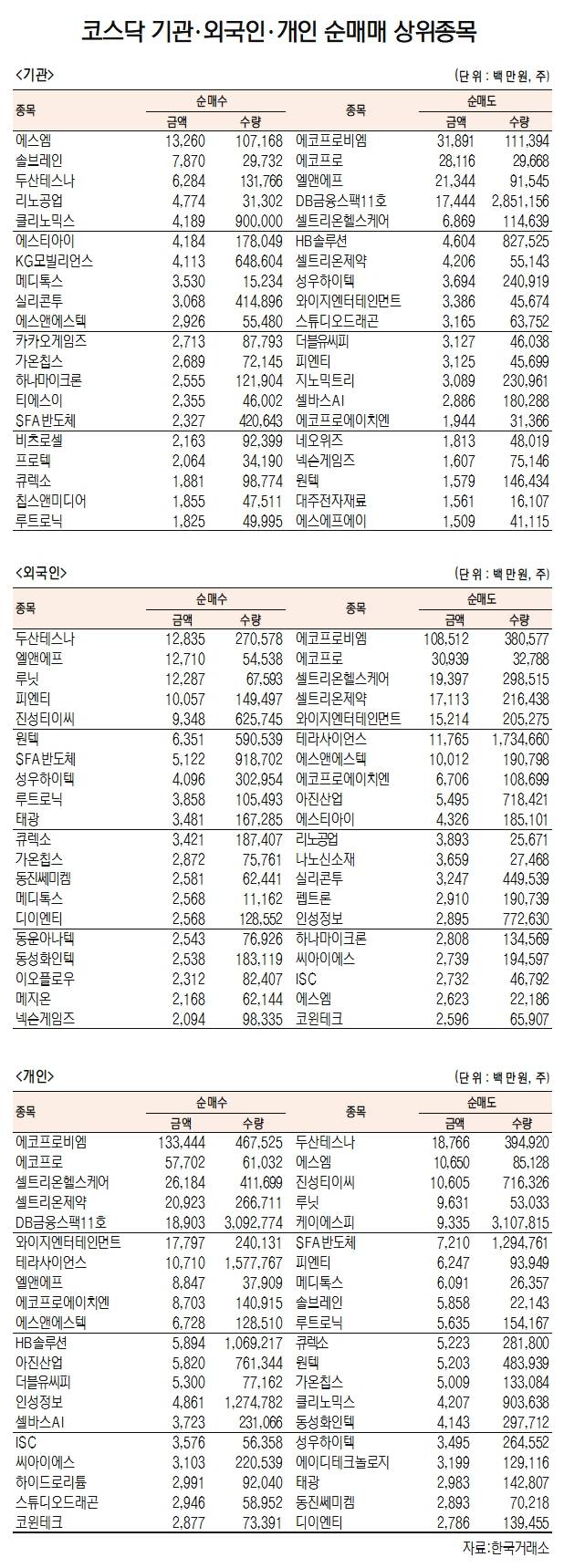 기관은 에스엠(041510)(133억원)을 비롯해 솔브레인(357780)(79억원), 두산테스나(131970)(63억원), 리노공업(058470)(48억원), 에스티아이(039440)(42억원), KG모빌리언스(41억원), 메디톡스(086900)(35억원), 실리콘투(257720)(31억원), 에스앤에스텍(101490)(29억원), 카카오게임즈(293490)(27억원), 가온칩스(399720)(27억원), 하나마이크론(067310)(26억원) 등을 매수했다. 순매도 상위 종목은 에코프로비엠(319억원)과 에코프로(281억원), 엘앤에프(066970)(213억원), DB금융스팩11호(174억원), 셀트리온헬스케어(69억원), HB솔루션(46억원), 셀트리온제약(42억원), 성우하이텍(015750)(36억원) 등이다.
