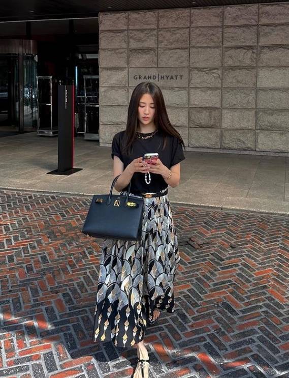 사진에서 박하선은 블랙 티셔츠에 독특한 패턴의 롱스커트를 입고 플랫 샌들을 매치해 우아하고 세련된 썸머룩을 완벽 소화했다. 여기에 체인 목걸이와 골드 버클 포인트 벨트, 각 잡힌 핸드백 등을 착용해 럭셔리함을 더했다.