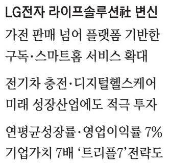 오랜 고민 끝에 LG전자는 이날 새로운 성장동력 세 가지를 기반으로 포트폴리오를 바꾸겠다고 밝혔다. 첫째는 '플랫폼 기반 서비스'다. 더 이상 TV 등 가전을 판매하는 데 그치지 않고 '플랫폼 기업'으로 다시 태어나겠다는 전략이다. 스마트TV 플랫폼인 '웹OS'의 무료 채널인 LG채널이 대표적인 예다. 조 사장은 "고객은 광고를 보는 대신 다양한 무료 콘텐츠를 즐기고, LG전자는 TV라는 미디어 플랫폼을 통해 광고 수익을 누리는 사업모델"이라고 말했다. LG전자는 LG채널 콘텐츠 강화를 위해 5년간 약 1조원 이상을 투자한다. 생활가전도 서비스 기반으로 바뀐다. 구매 뒤 새 기능을 더해주는 '업(UP)가전'을 더욱 키우고 구독과 스마트홈을 접목한 'HaaS(Home as a Service)'를 내놓는 게 목표다. LG전자는 가전 렌탈·케어십 서비스도 확대한다. 렌탈·케어십 서비스는 최근 5년간 매출이 연평균 30% 성장한 분야다.