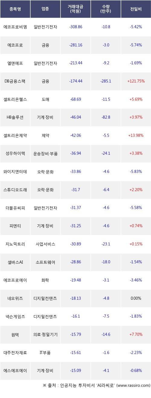 기관 투자자의 순매도 상위 20개 종목은 에코프로비엠, 에코프로, 엘앤에프, DB금융스팩11호, 셀트리온헬스케어, HB솔루션, 셀트리온제약, 성우하이텍, 와이지엔터테인먼트, 스튜디오드래곤등이다.