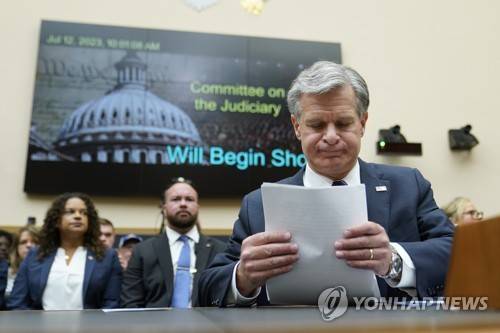 FBI Director Christopher Wray prepares to testify before a House Committee on the Judiciary oversight hearing, Wednesday, July 12, 2023, on Capitol Hill in Washington. (AP Photo/Patrick Semansky)