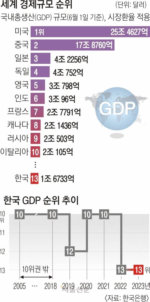 우리나라의 GDP 순위는 2005년 10위에 오른 뒤 2018년 다시 10위에 올랐다. 이어 2020년과 2021년 10위를 지켰으나 2년 만에 3계단 하락했다. 여기에는 수출 부진과 저성장 등 경제의 활력이 전반적으로 떨어진 것과 함께 ‘킹달러’ 현상으로 인한 원화 가치 하락이 작용한 것으로 분석된다. 원화를 기준으로 한 우리나라의 지난해 명목 GDP는 2161조 8000억원으로 전년 대비 3.9% 증가했다. 반면 달러를 기준으로 하면 12.9% 급등한 원달러 환율 탓에 7.9% 감소했다. 지난해 무역수지가 472억 달러 적자를 내 14년 만의 적자이자 사상 최대 적자를 기록한 것도 경기 위축과 원화 가치 하락을 이끌었다. 반면 러시아와 호주, 브라질은 자원 부국으로 글로벌 원유 및 원자재 가격 상승의 수혜를 누렸다. 수출 증가가 자국의 통화 가치를 방어하며 달러 기준 명목 GDP를 끌어올린 것으로 분석된다.