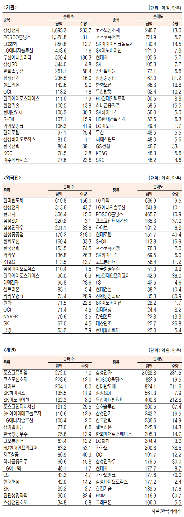 기관은 삼성전자(005930)(1695억원)를 가장 많이 매수한 가운데 POSCO홀딩스(005490)(1329억원), LG화학(051910)(851억원), LG에너지솔루션(373220)(409억원), 두산에너빌리티(034020)(350억원), 삼성SDI(006400)(344억원), 한화솔루션(009830)(261억원), 삼성전기(009150)(237억원), 셀트리온(068270)(143억원), OCI(456040)(118억원), 한화에어로스페이스(012450)(111억원), 한전기술(052690)(110억원), 한미반도체(042700)(108억원) 등을 순매수했다. 순매도 상위 종목은 코스모신소재(247억원)와 포스코퓨처엠(222억원), SK아이이테크놀로지(130억원), SK이노베이션(121억원), 현대차(005380)(106억원), SK(105억원), 삼아알미늄(77억원), 삼성중공업(010140)(67억원), 한화오션(042660)(66억원), 두산밥캣(63억원), HD현대일렉트릭(61억원), 하나금융지주(59억원), SK하이닉스(56억원), HD현대건설기계(53억원) 등이다