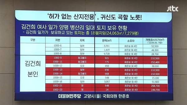 | ▲ 2022년 10월 6일 열린 국회 국토교통부 국정감사에서 한준호 더불어민주당 의원이 김건희 여사 일가가 보유한 양평군 강상면 병산리 일대 토지 관련 자료를 띄운 모습. |
