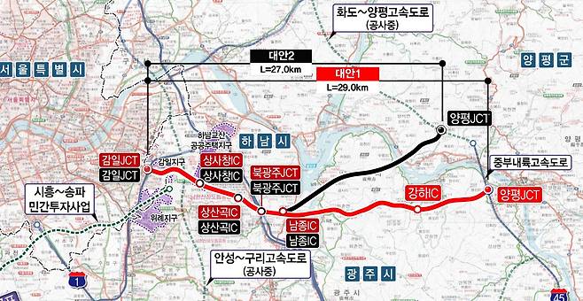 | ▲ 서울-양평 고속국도 건설사업 전략환경영향평가서(초안) 요약문 상 자료. 지도상 빨간색인 '대안1'의 종점 부근에 김건희 여사 일가의 땅이 있다. 지도상 검은색인 '대안2'는 2021년 4월 예타 통과 당시의 노선이다. |