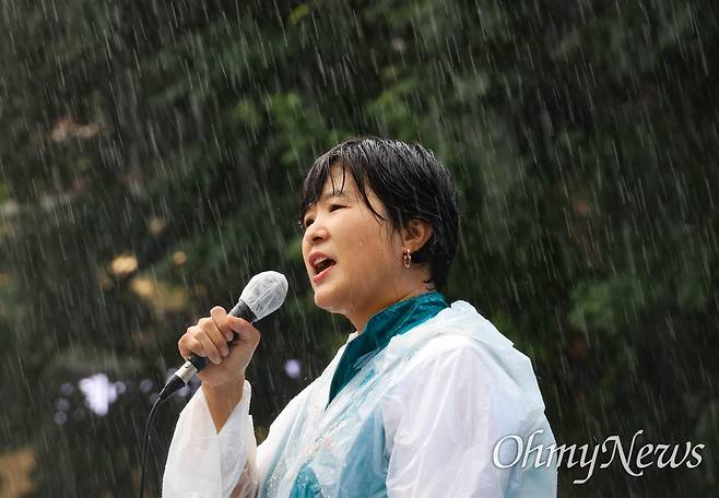 | ▲ 전희영 전교조 위원장이 13일 오후 서울 종로 보신각앞에서 열린 ‘총파업 승리 전국교사 결의대회’에서 폭우를 맞으며 발언하고 있다. |