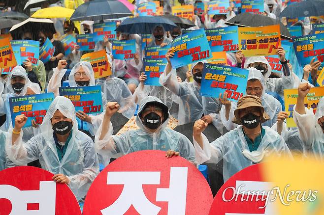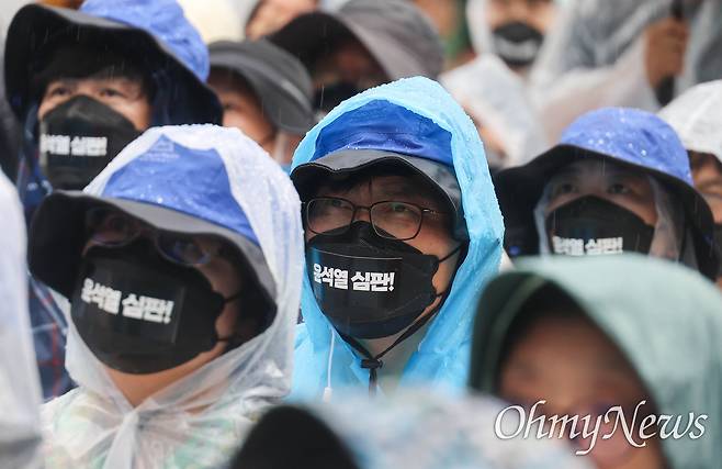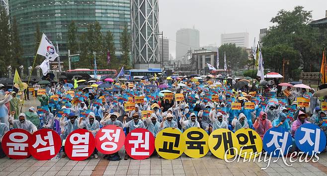 전국교직원노동조합(전교조) 소속 교사 600여 명이 "수능문항이 킬러가 아니라 핵 오염수로 국민들의 생명을 포기한 윤석열 정부가 킬러 정권"이라고 장대비 속에서 외쳤다.