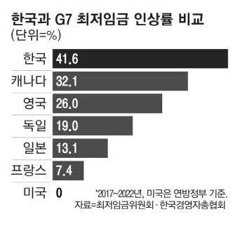 13일 최저임금위원회와 한국경영자총협회에 따르면 2017년부터 2022년까지 한국의 최저임금 누적 인상률은 G7 국가들보다 높았다. 2017년 6470원이던 최저임금은 지난해 9160원으로 41.6% 올랐다. 이는 법정 최저임금 제도가 없는 이탈리아를 제외한 G7 국가와 비교했을 때 가장 높은 인상률이다.