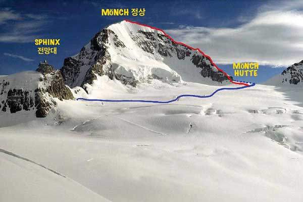 수도승이라는 전설과 달리 묀히는 거칠었다. 아이거 북벽보다는 순하지만 거친 남벽을 보는 순간 '사람이 오를 수 있는 산이 맞나'하는 생각이 들었다. 첫 만남부터 기세에 눌리긴 싫었지만, 우락부락한 거대한 괴물이 귀에 대고 고함을 지르는 것 같았다. 아이거에 비해 점잖다뿐이지, 국내파 토종 산꾼의 눈엔 괴물 같은 산이었다.