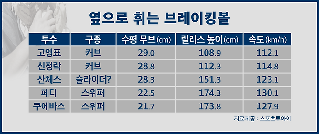 즉 거칠게 말해 '옆구리 투수'들의 공은 옆으로 휘고, '정통파 투수'들의 공은 위아래로 휜다.
