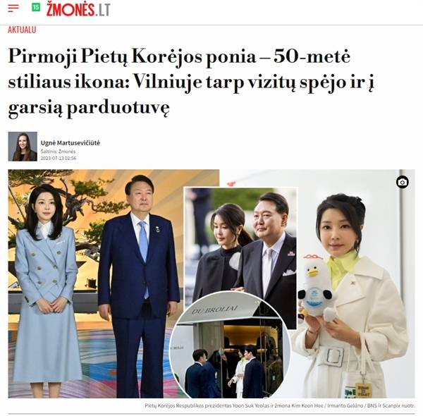리투아니아의 < ZMONES.LT >와 < 15 min > 등 인터넷신문은 지난 12일(현지 시각) '한국의 퍼스트 레이디는 50세의 스타일 아이콘 : 방문 일정 중에 유명한 가게도 들르다'라는 제목의 기사를 게재했다.