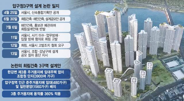 시는 압구정 3구역 재건축조합의 설계 공모가 재건축 규정과 조합의 공모 지침을 위반했다며 공모 절차를 중단하도록 강남구청과 재건축조합에 시정 명령도 내렸다고 밝혔다. 이 같은 시정 명령은 실제 행정 효력은 없다. 그럼에도 서울시가 긴급 브리핑을 열어 시정 명령을 공표한 것은 시가 제시한 가이드라인과 배치되는 설계안을 향후 절대 받아들이지 않겠다는 방침을 명확히 하겠다는 취지로 풀이된다. 시는 4월 열린 압구정 3구역 신통기획 주민 설명회에서 용적률 300% 이하와 임대주택 소셜믹스 등을 핵심으로 하는 정비 지원 계획안을 제시했다. 하지만 희림건축이 용적률 360%에 조합원과 임대주택·일반분양을 분리하는 내용의 설계안을 내놓았고 이에 해안건축이 한때 홍보관을 폐관하며 반발하는 등 논란이 불거졌다. 시는 재차 용적률은 최대 300%만 가능하다고 밝혔으나 희림건축은 인센티브 등을 적용할 경우 용적률 상향이 가능하다며 굽히지 않았다. 결국 시는 11일 사기 미수와 업무 방해 및 입찰 방해 혐의로 희림건축을 고발한 상태다.