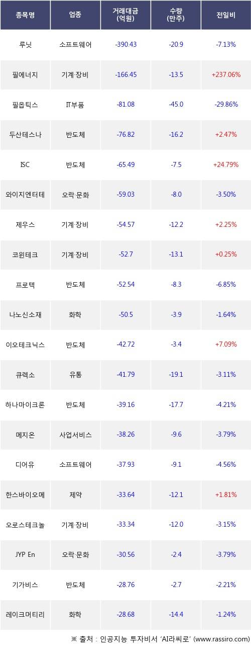 외국인 투자자의 순매도 상위 20개 종목은 루닛, 필에너지, 필옵틱스, 두산테스나, ISC, 와이지엔터테인먼트, 제우스, 코윈테크, 프로텍, 나노신소재등이다.