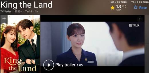 15일 세계적 영화 정보 사이트 IMDB에 따르면, ‘킹더랜드’의 평점은 10점 만점에 1.9점에 불과하다. 지난 11일에는 2.2었는데, 4일만에 2점대 이하로 내려갔다.