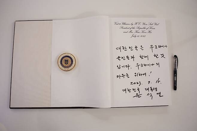 [키이우(우크라이나)=뉴시스] 전신 기자 = 윤석열 대통령이 15일(현지시간) 키이우 마린스키 궁을 방문해 남긴 방명록. (사진=대통령실 제공) 2023.07.15. photo@newsis.com
