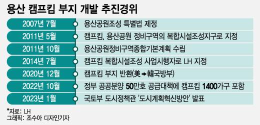 LH가 캠프킴 부지의 개발구상을 짜는 것은 이번이 처음이 아니다. 2019년 용역을 발주해 기본구상안을 수립하고 이를 바탕으로 국토교통부는 2020년 8·4 공급대책에서 3100가구를 공급하겠다고 발표한 바 있다. 2022년 10월 발표한 '공공분양 50만호 공급대책'에서는 이 중 1400가구를 공공분양으로 공급하겠다는 계획도 추가로 밝혔다.