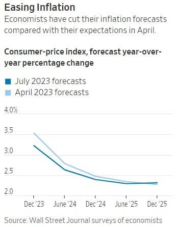 경기침체 우려가 전망이 축소한 것은 미국 인플레이션이 완화하기 시작해서다. WSJ에 따르면 응답자 중 60%는 인플레이션 둔화를 낙관론의 근거로 들었다. 미국 6월 소비자물가지수(CPI) 상승률은 전년 같은 달 대비 3.0%를 기록하며 2021년 3월 이후 2년여 만에 최저 수준으로 낮아졌다. 미국의 6월 생산자물가지수(PPI)도 전년 같은 달 대비 0.1% 오르는 데 그치며 인플레이션에 대한 우려가 대폭 완화했다.