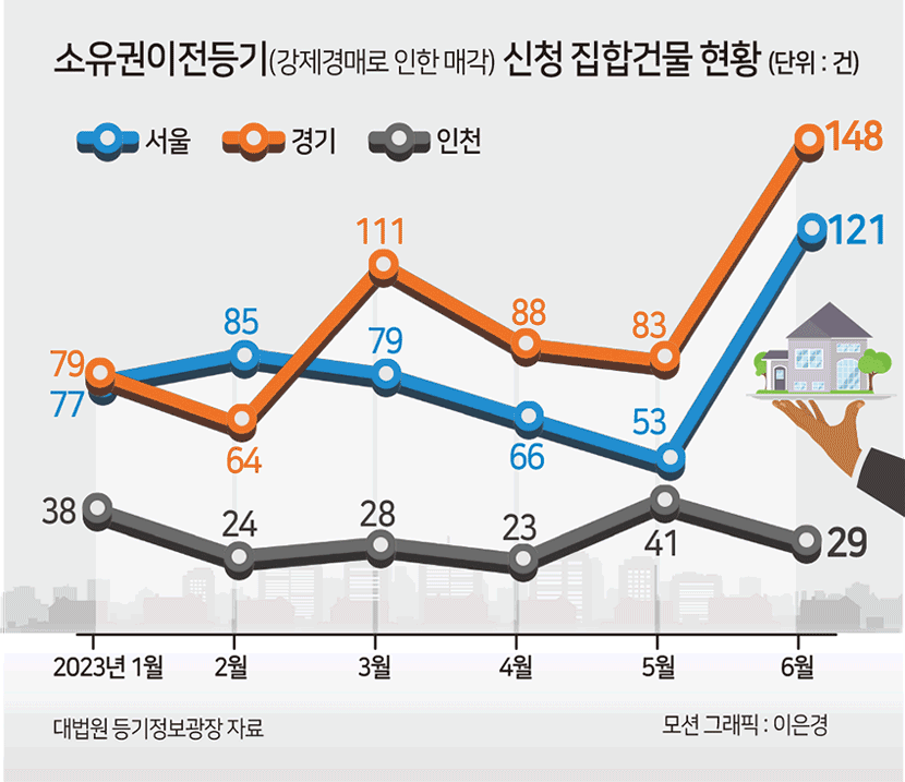 16일 대법원 등기정보광장에 따르면, 6월 한 달간 전국에서 강제경매로 인한 매각에 의한 소유권이전등기가 신청된 집합건물 건수는 551건이다. 5월은 361건으로 집계됐는데 한 달 새 36% 증가한 것이다. 지난 1월 335건→2월 314건→3월 386건→4월 399건 등으로 5개월 연속 300건대를 기록하다가 지난달 200건 가까이 늘었다.