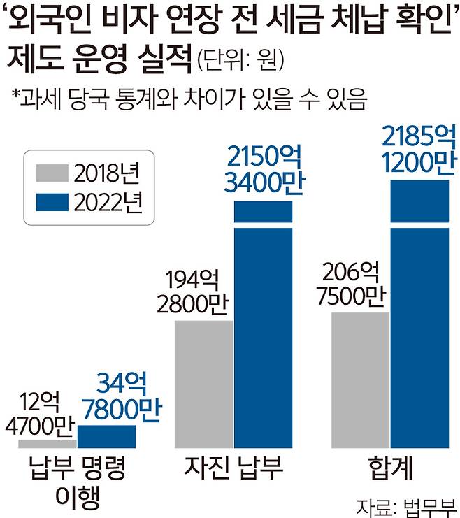 16일 법무부에 따르면 지난해 세금 체납 확인 제도로 외국인 체납액 2185억1200만원이 납부됐다. 이 중 2150억3400만원은 자진 납부, 나머지 34억7800만원은 납부 명령 이행에 따른 것이다. 제도가 본격적으로 시행된 2018년(206억7500만원)과 비교해 10배 넘게 증가한 수치다.