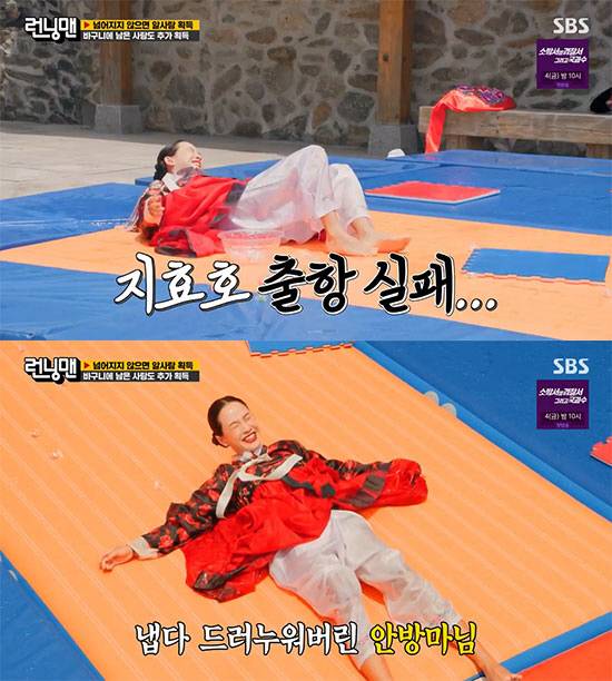 한편 송지효는 최근 태도 논란에 휩싸였다. 과거에는 몸을 던져 게임에 임하며 에이스로 활약했던 송지효가 최근에는 리액션에 소극적이고 무성의한 태도를 보이고 있다는 것. 하지만 이날 송지효는 알사탕 획득을 위해 미끄러운 물에 징검다리를 건너가는 '몸개그'를 보이는 미션에서, 앞서 밝힌 부모님의 직업에 호응하며 "뿌앙"이라는 파이팅으로 재미를 안겼으며, 점프할 때마다 '大'자로 미끄러지는 몸개그로 큰 웃음을 안겼다.