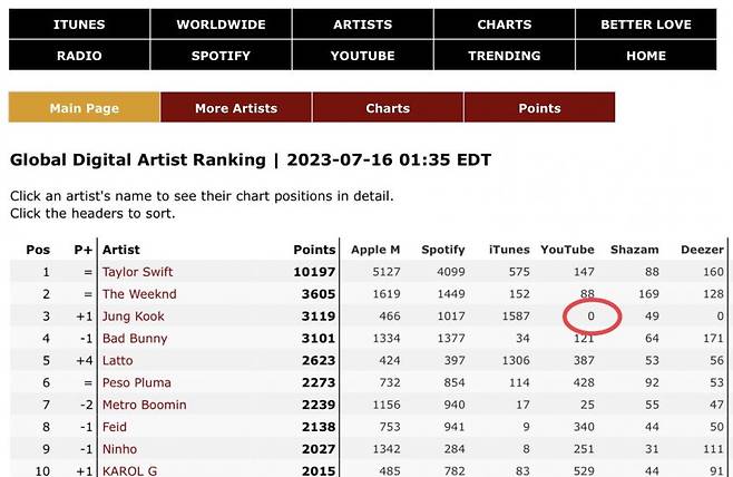 정국의 글로벌 디지털 아티스트 랭킹은 테일러 스위프트, 더위켄드에 이은 3위다. 정국은 유튜브와 Deezer 점수가 각각 0점에 그쳤다. 4위인 스페인어권 가수 배드 버니의 유튜브 점수는 121점, 역시 스페인어로 노래를 자주 부르는 캐롤G(10위)의 유튜브 점수는 529점이나 된다.