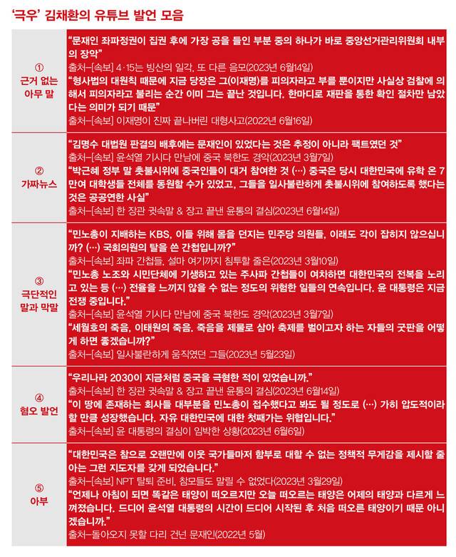 이로부터 나흘 전, 대통령실은 15명의 장차관급 정무직 인선안을 발표했다. 그중 한 명이 김 원장이다. 국가공무원인재개발원장은 차관급 자리다. 신임 인재개발원장으로 지명되기 직전까지 그는 자신의 유튜브 <김채환의 시사이다>를 운영했다. 채널 설명에는 ‘진실된 뉴스, 팩트를 기반으로 정치 사회적 사건의 이면을 분석하여 전달하는 채널’이라고 돼 있다. (2023년 7월13일 기준 채널 설명은 ‘윤석열 대통령의 국정철학이 모든 국민들께 올바로 전달되도록 합니다’로 바뀌었다. 동영상은 모두 비공개로 전환됐다.)