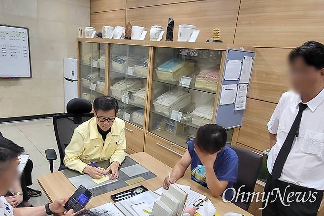 | ▲ 신형근 행정국장 등 충청북도 관계자들이 16일 오후 9시께 청주 흥덕구 하나노인전문병원 장례식장에 안치된 오송 지하차도 참사 희생자 4명의 유족과 면담했다. |