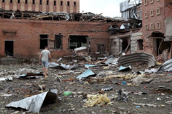 | ▲ 러시아군 미사일 공격으로 일부가 파괴된 우크라이나 동부 도네츠크주 크라마토르스크의 건물 앞을 9일(현지시간) 한 남성이 지나고 있다. |