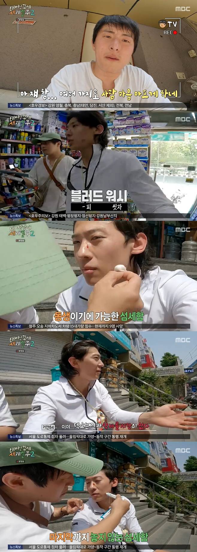 덱스의 얼굴을 발견한 기안84는 "쟤 참 여러가지로 사람 마음 아프게 한다"며 약국에 들러 소독약을 구매했다.