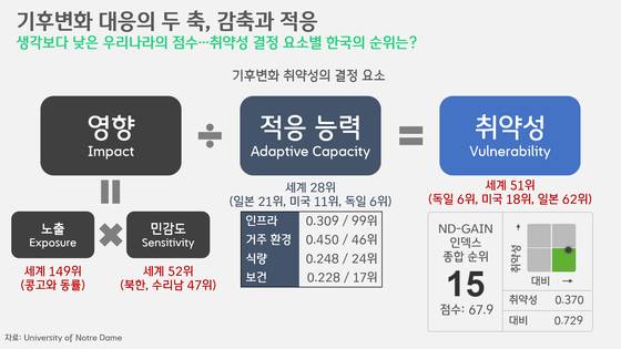 지난 3일, 190번째 연재 〈[박상욱의 기후 1.5] 폭염과 호우가 공존하는 올여름…우리의 적응력은?〉에서 우리나라의 취약성에 대해 설명해 드린 바 있습니다. 취약성은 기후변화로 인한 영향과는 비례하고, 적응 능력과는 반비례하게 되죠. 그런데, 미국 노터데임의 ND-GAIN 인덱스 평가 결과, 우리나라가 노출된 기후변화의 양상은 세계 최하위 수준으로 매우 심각한 것으로 드러났습니다. 그런 환경에 노출됐을 때, 국가와 사회의 민감도는 북한이나 수리남보다도 더 민감하고요.