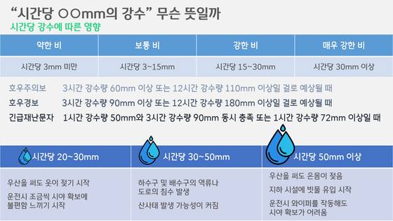 시간당 50mm 이상의 비가 내리는 경우, 우산을 편들 온몸이 젖을 만큼 온 사방에서 빗방울이 튀게 됩니다. 지하 시설엔 빗물이 유입되기 시작하고, 운전자가 아무리 와이퍼를 작동한다 해도 전방 시야를 확보하기 어려워집니다. 지난해 서울 강남 지역의 침수를 떠올리며 '시간당 100mm 이상'을 재난재해 발생의 바로미터로 여긴다면, 큰 오산입니다. 시간당 30mm만 되더라도 우리에게 큰 피해를 입힐 수 있기 때문입니다.