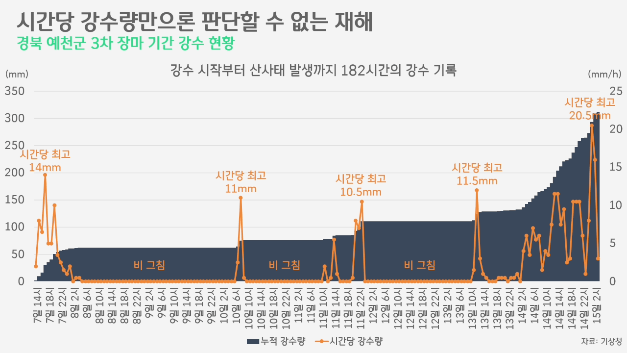 3차 장마의 첫 강수 시작부터 산사태 발생 때까지, 예천군에선 비가 내린 시간보다 비가 그친 시간이 훨씬 길었습니다. 7일부터 산사태 전날인 14일까지, 아무리 강하게 비가 쏟아졌다 한들, 시간당 강수량은 11mm 안팎에 불과했습니다. 강수가 시작된 7일부터 만 나흘이 지나서야 누적 강수량이 100mm를 넘어섰을 정도였죠. 강수의 강도도, 강수의 총량도, 예보나 장마 소식을 전하는 과정에서 주목받기 어려운 수준이었던 겁니다.