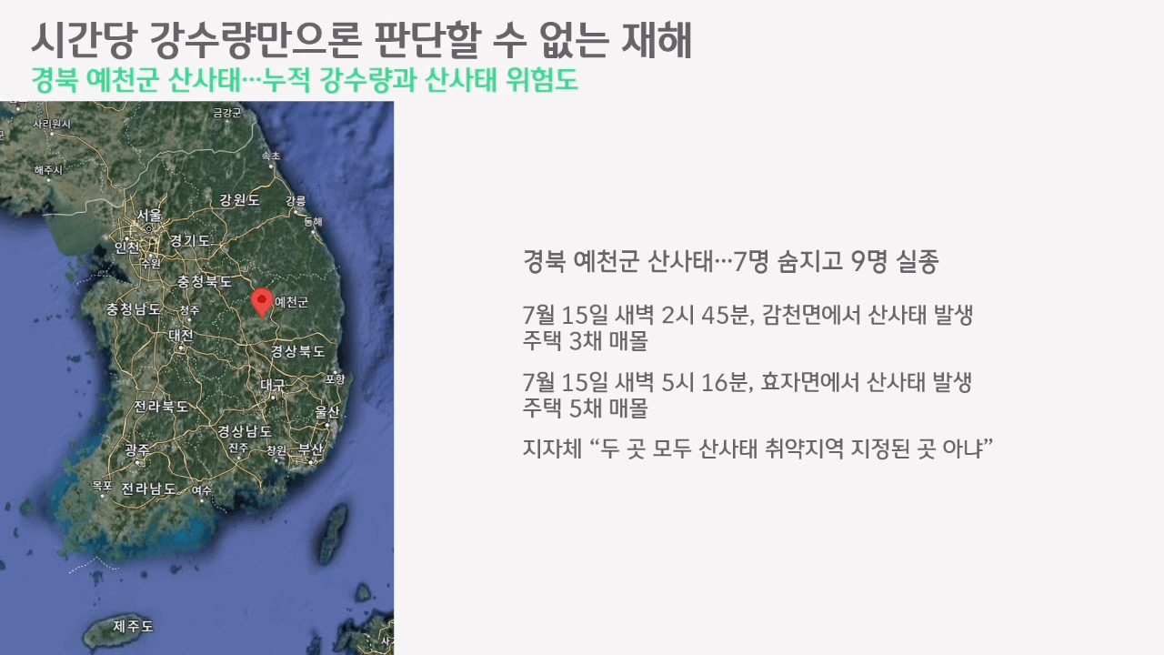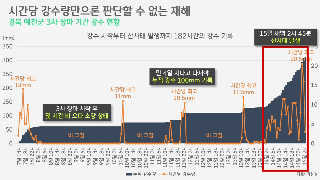그런데, 이러한 '시간당 강수량'만으로 재해재난을 내다보고, 예방하고, 대비할 수 있는 것은 아닙니다. 산사태로 대규모의 인명피해가 발생한 경북 예천군의 사례는 바로 시간당 강수량에만 집중했을 때 '심각한 재해 대비 공백'이 발생할 수 있음을 여실히 보여줬습니다.