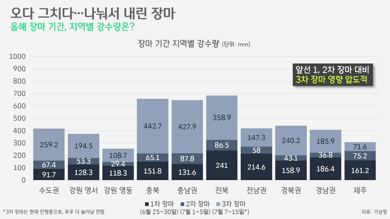 지금도 전국 곳곳에선 수색과 구조 작업이 한창 진행 중인 가운데, 장마는 여전히 현재 진행형입니다. 지금까지 들려온 피해 양상과 규모만 봐도 '역대 최악의 장마'로 꼽힐 듯한데, 기록을 보면 걱정은 더욱 커질 수밖에 없습니다. 1차와 2차, 3차로 나뉘어 내린 장마 중 강수의 대부분이 이번 3차에 집중되어 있습니다. 그리고 되돌릴 수 없는 인명피해 또한 3차 장마에 집중되어 있고요. 산사태뿐 아니라 오송 지하차도에서 벌어진 참사의 경우 인재라는 평가마저 나오는 상황입니다. 앞선 1~2차 장마가 3차 장마에 대한 경각심을 높이게 하기보다, 도리어 안일하게 만든 것은 아닌지 우려될 수밖에 없는 이유입니다.