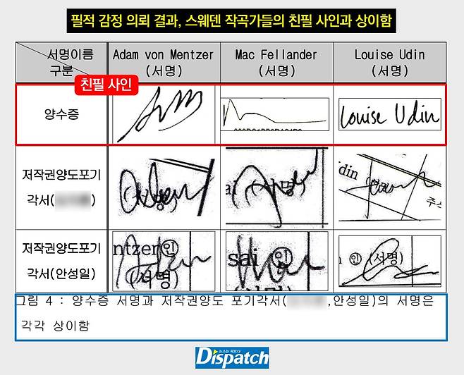 문제는, '권리양수도계약서' 사인과 '지분변경확인서' 사인이 각각 다르다는 것. '디스패치'는 전문 감정사에게 필적 감정을 의뢰했다.