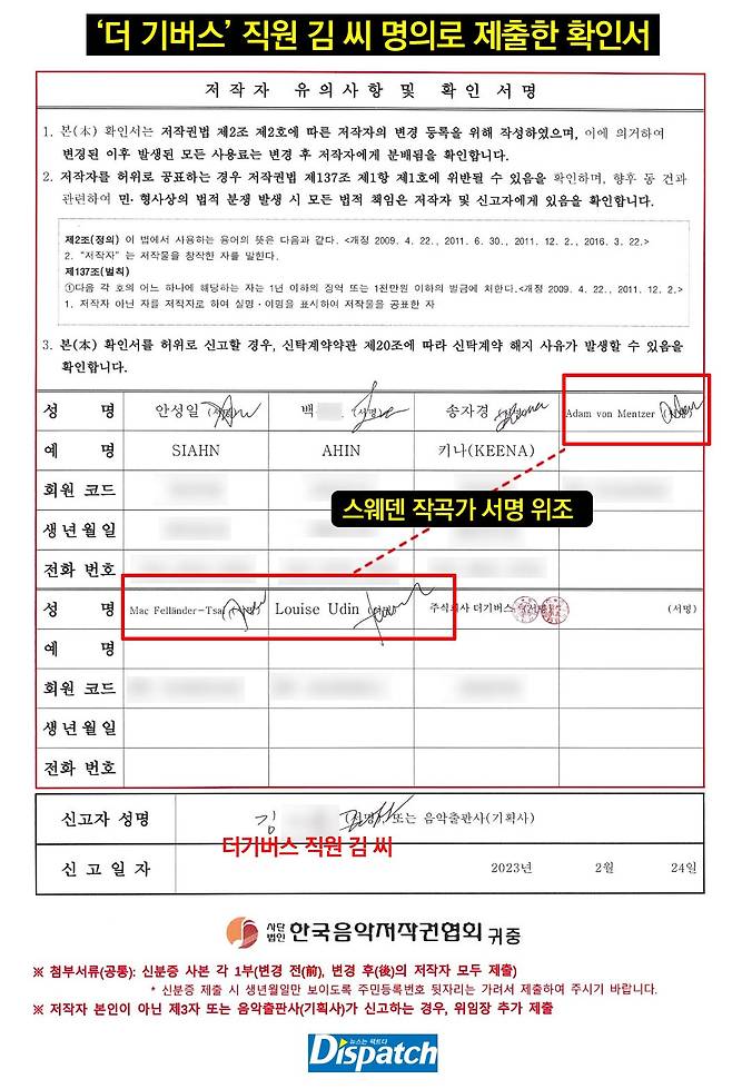 '디스패치' 취재 결과, 안성일은 2차례 사인을 위조했다. 먼저, '더기버스' 직원 김 씨 이름으로 위조 사인을 제출했다. 하지만 서류 미비 등의 이유로 반려된 것으로 확인된다.