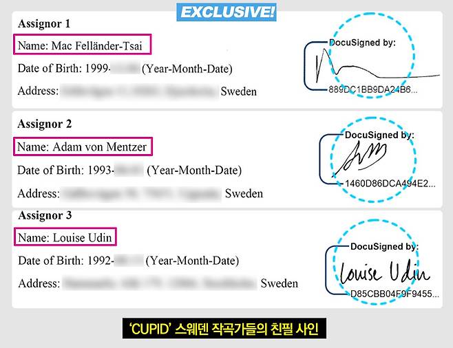 '권리양수도계약서'는 안성일이 큐피드 저작권을 매입(2023년 2월)할 때 작성한 것이다. 스웨덴 작곡가 3명이 친필 사인을 했다.