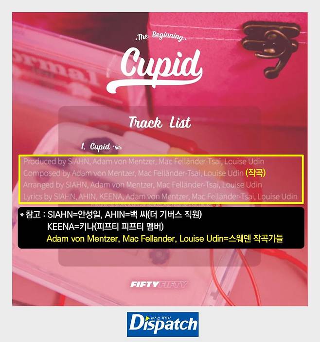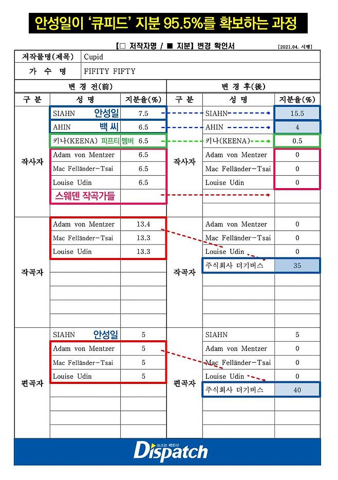 안성일은 '큐피드' 지분을 95.5%까지 늘렸다. 스웨덴 작곡가 지분은 0%. 멤버인 키나(송자경) 지분까지 건드렸다. 키나의 작사 지분은 6.5->0.5로 쪼그라들었다.