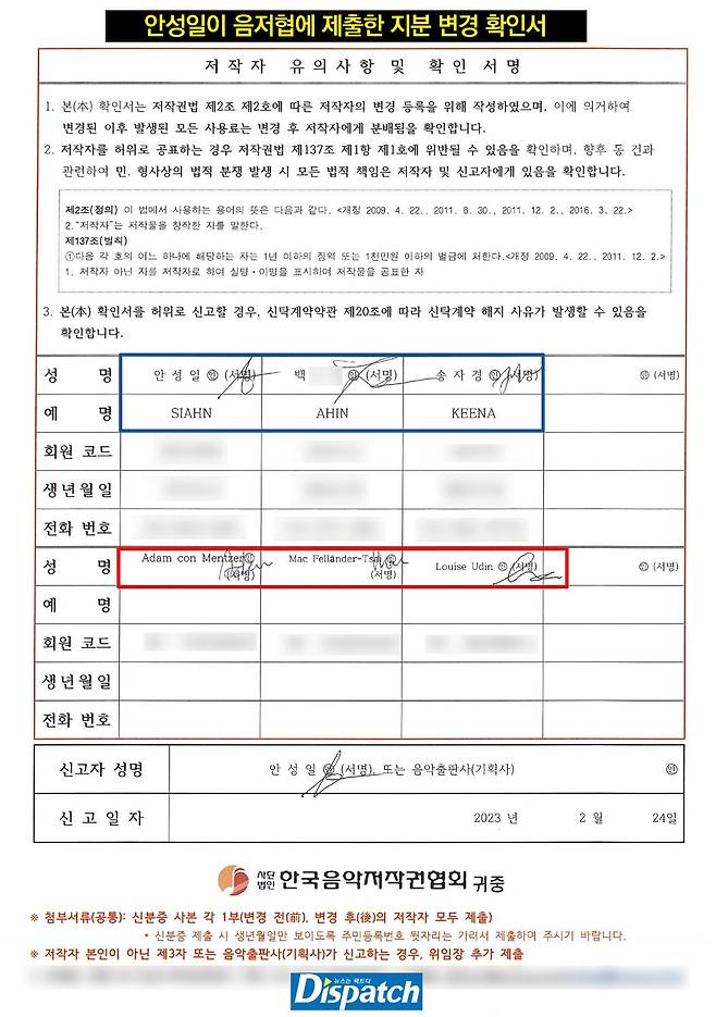 '디스패치'는 안성일이 저작권협회에 제출한 <지분변경확인서>를 입수했다.