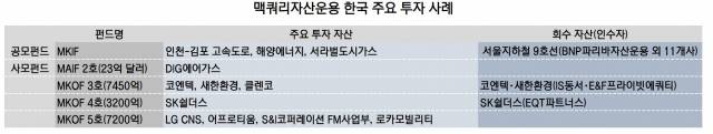 맥쿼리사모펀드는 7월 누적 기준 운용자산(AUM)이 비상장펀드를 포함해 6조 2000억 원에 달한다. 2020년 MBK파트너스로부터 산업용 가스 업계 1위인 DIG에어가스(옛 대성산업가스) 지분 100%를 2조 5000억 원에 인수했다. 폐기물과 도시가스 사업 등에 일찌감치 뛰어들어 에너지 및 인프라 투자의 저변을 넓혔다는 평가를 받는다.