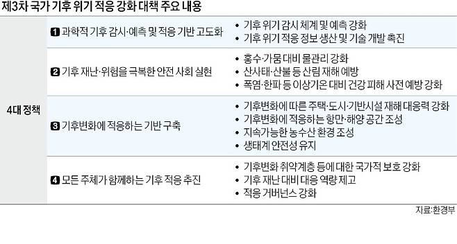 환경부가 발표한 이번 3.5차 대책과 기존 대책의 가장 큰 차이는 ‘모든 주체가 함께하는 기후 적응 추진’이다. 정부는 기존 대책에 더해 이번 3.5차 대책에는 기후변화로 인한 위험에 노출된 취약계층에 폭염·한파 등 정보를 직접 전달해 스스로 위험을 회피하도록 하는 방안과 기업·금융기관에 기후 시나리오 등 기후 리스크 정보에 대한 접근권을 높여 대응 역량을 갖춘 집단이 자체 전략을 수립해 이행하도록 하는 방안을 보완했다. 아울러 기후 위기 적응법을 제정해 적응 대책의 안정적 추진을 위한 법적 기반을 갖추는 방안도 포함했다.