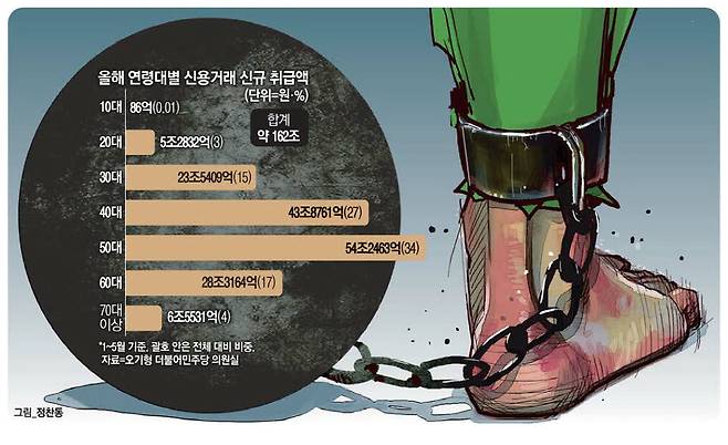 특히 중·장년층인 4050세대가 주식투자 과정에서 빚투를 가장 많이 활용하고 있는 것으로 나타났다. 연령대별 증권사 신용거래 비중을 보면 40대가 27%, 50대가 34%인 것으로 드러났다. 금액 규모로는 40대가 43조8761억원, 50대가 54조2463억원이다. 20대는 5조2832억원, 30대는 23조5409억원으로 집계됐다. 올 1~5월 5대 시중은행 마이너스통장 신규 개설 건수와 잔액도 40대가 각각 3만400건, 1조4000억원으로 가장 높았다.