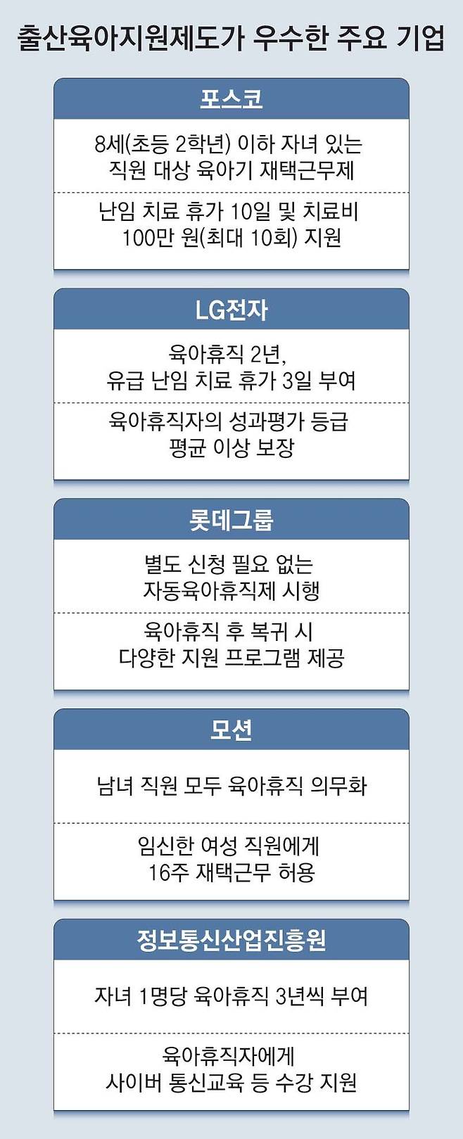 포스코 관계자는 “육아기에 있는 직원들이 대부분 대리, 과장급인 30대로 왕성하게 일하며 경력을 쌓아갈 시기”라며 “회사 차원에서도 새 인력으로 대체하는 것보다 업무 공백 없이 숙련된 인재를 확보하는 게 더 좋다”고 설명했다. 만 8세 이하 자녀를 둔 포스코 직원 가운데 출산·육아 지원 제도를 이용하는 비율은 2019년 23.8%에서 2022년 34.8%로 늘었다.