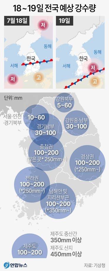 기상청은 “19일 오전까지 정체전선과 저기압에 의해 많은 비가 추가로 내리겠다”고 18일 예보했다.