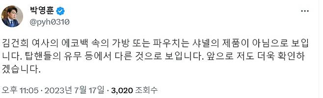 18일 정치권에 따르면, 민주당 청년미래연석회의의 박영훈 부의장은 최근 자신의 트위터에 에코백을 든 김건희 여사의 사진과 함께 "에코백 들고 내리는 김건희 여사, 에코백 속에 숨겨진 가방은 샤넬 명품 가방"이라고 썼다.