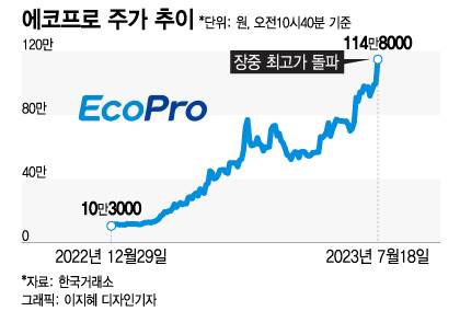 18일 한국거래소에 따르면 오후 1시30분 증시에서 에코프로는 전일 대비 11만4000원(11.41%) 오른 111만3000원에 거래 중이다. 장중 사상 최고가인 114만8000원까지 터치했다. 올해 들어서만 1000%에 달하는 상승률 보였다.